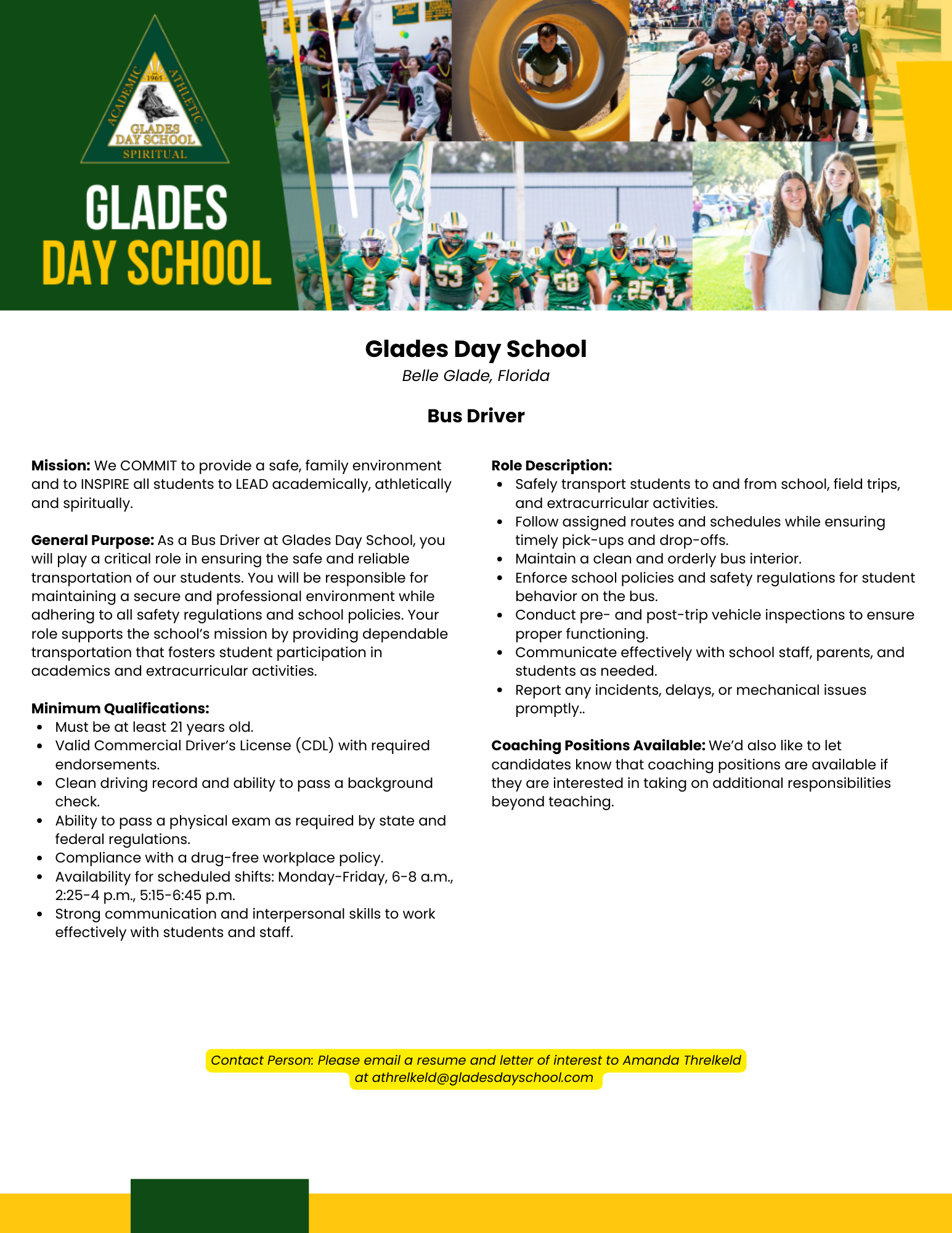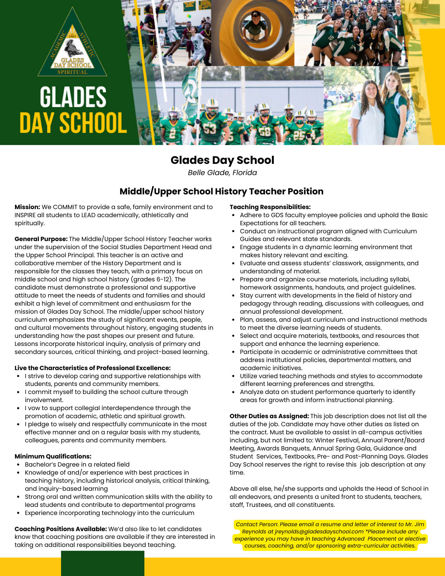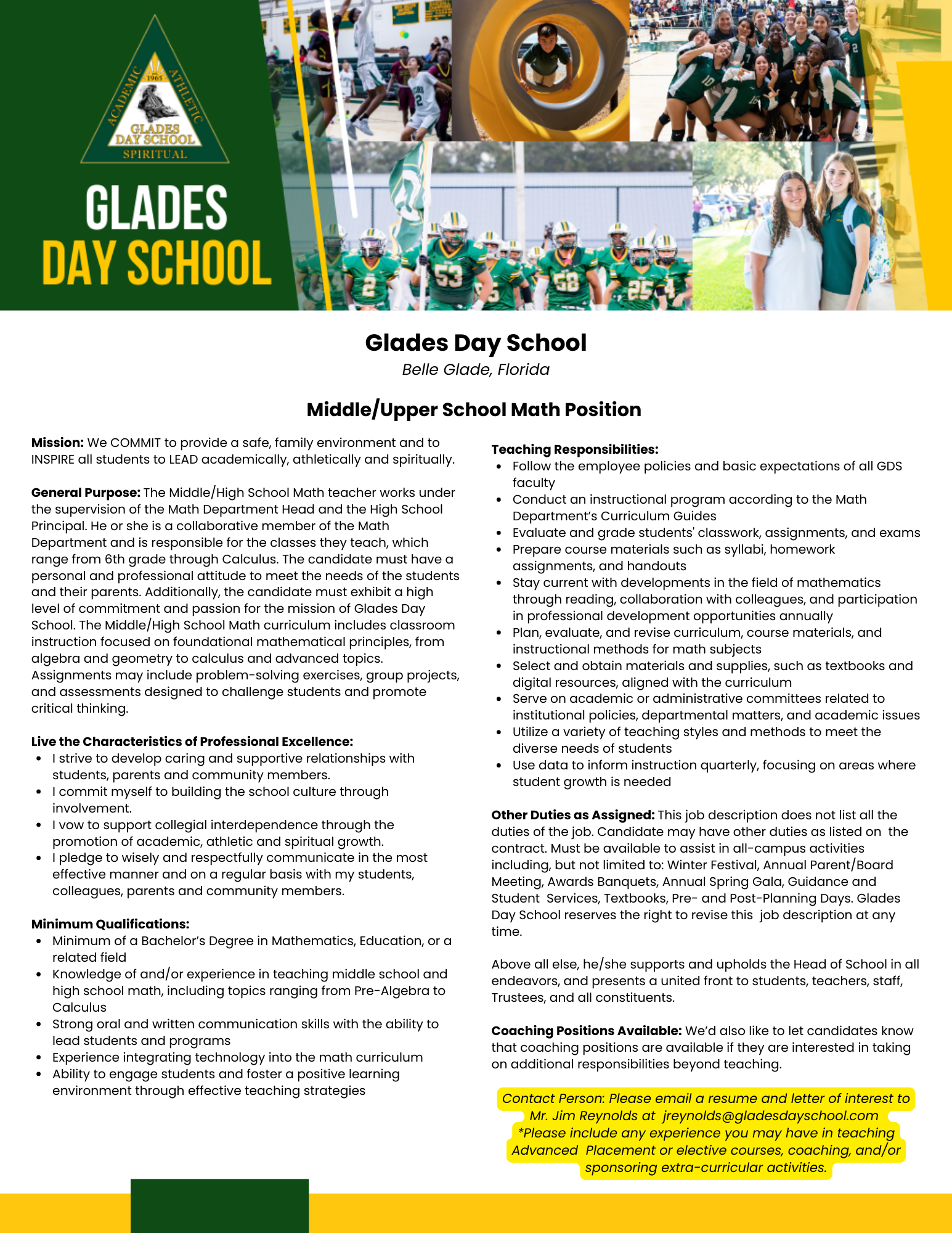 Thank you for your interest in working at Glades Day School. We are always looking for passionate individuals to join the Gator family.